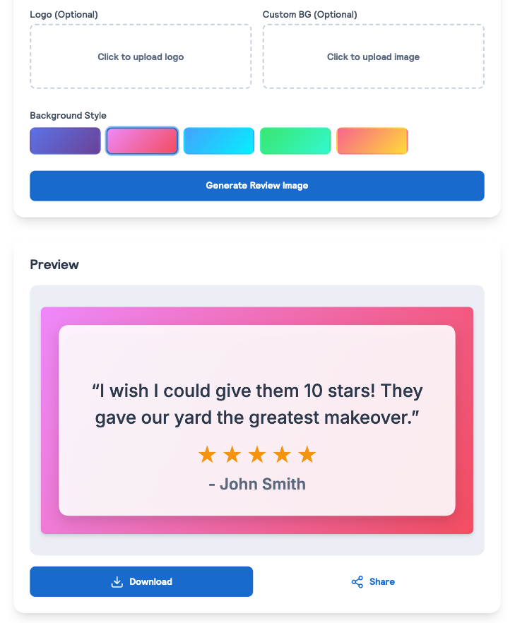 Click the "Generate Review Image" button. Once you see the preview, you can Download it to your device or click Share. Done!
