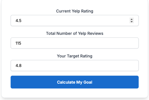 Use this free calculator to set a clear, achievable goal for your reviews, so you can start turning Yelp visitors into customers.